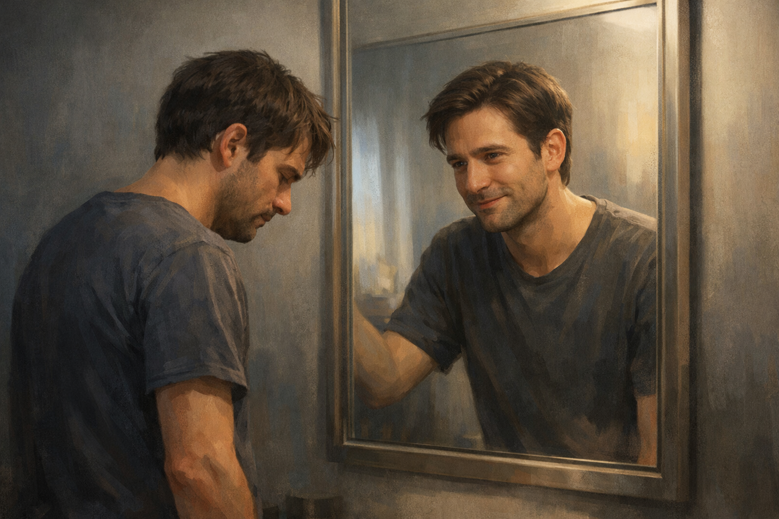 Awareness often returns only through an external mirror — for example, when briefly seeing one’s reflection in a restroom mirror and realizing: “I don’t look healthy or relaxed right now.”