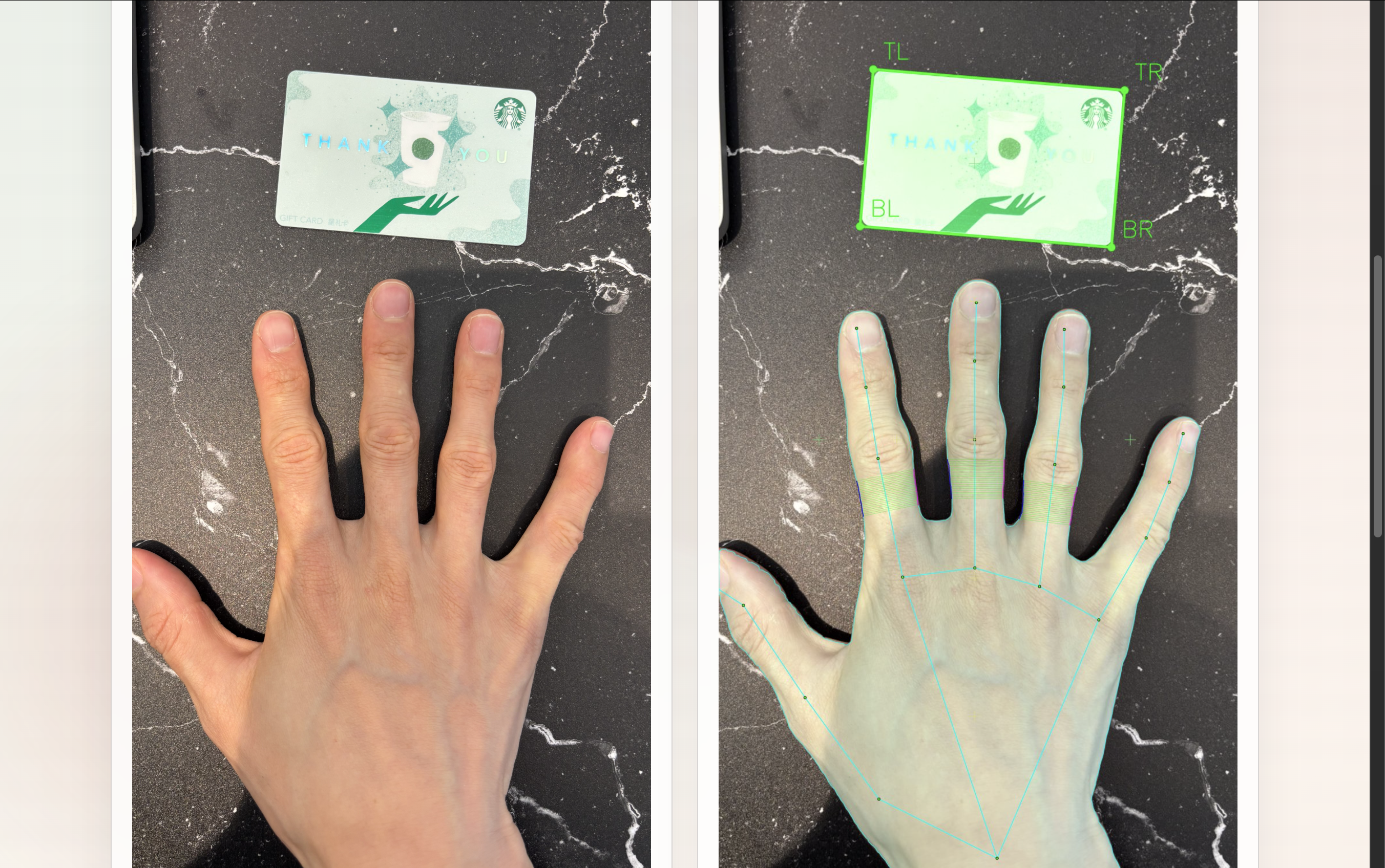 | MediaPipe (current) | 0.2 s | Poor — convex polygon, doesn’t trace fingers, nails, or inter-finger gaps |